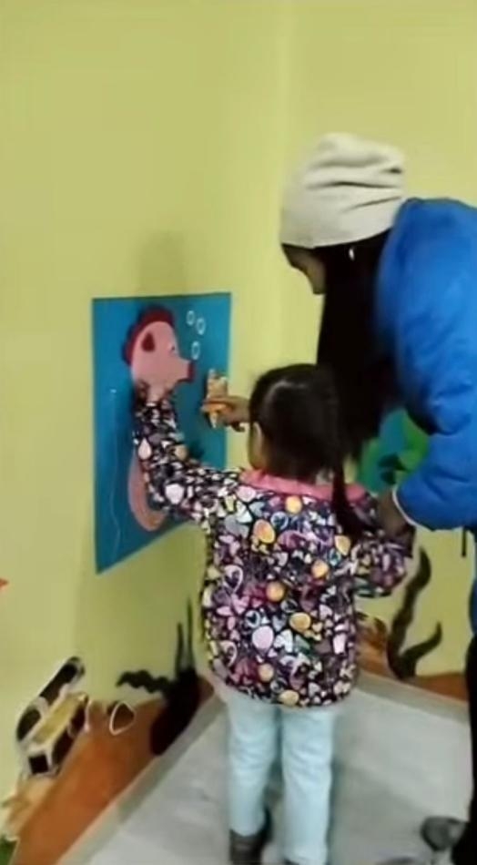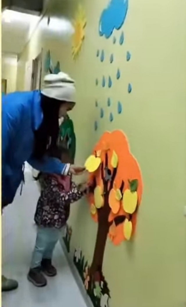 №1 "Балапан" тобының тәрбиеленушісі Айтқұл Нұрдария анасымен бөбекжайымыздың дәлізінде жасақталған дамытушы ортамен танысуда.
