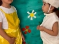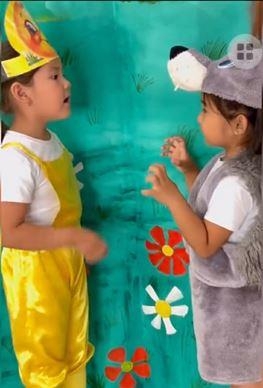 Мақсаты: Театрланған әрекет арқылы балалардың – эмоция – ынталандыру — сөйлеу әрекеттерін дамыту. Әуен ырғағымен кейіпкерлердің қимылдарын орындай білуге үйрету.