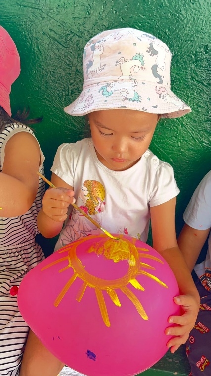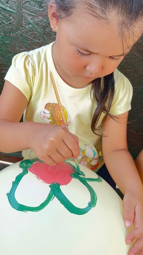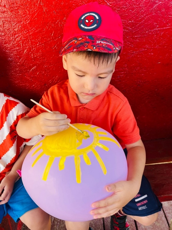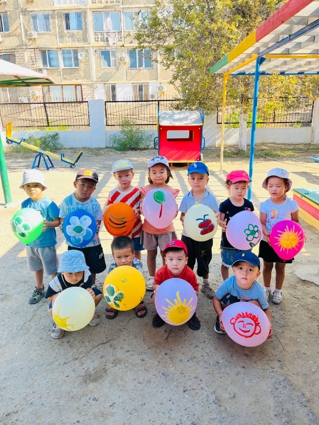 01.08.2024 жылы «Алақай, жайдарлы жаз келді» жазғы сауықтыру жоспарының «Менің достарым» апталығы бойынша «Түрлі-түсті кемпірқосақ күні» айдарына сәйкес, «Ең көңілді шарлар» шарларға сурет салу.