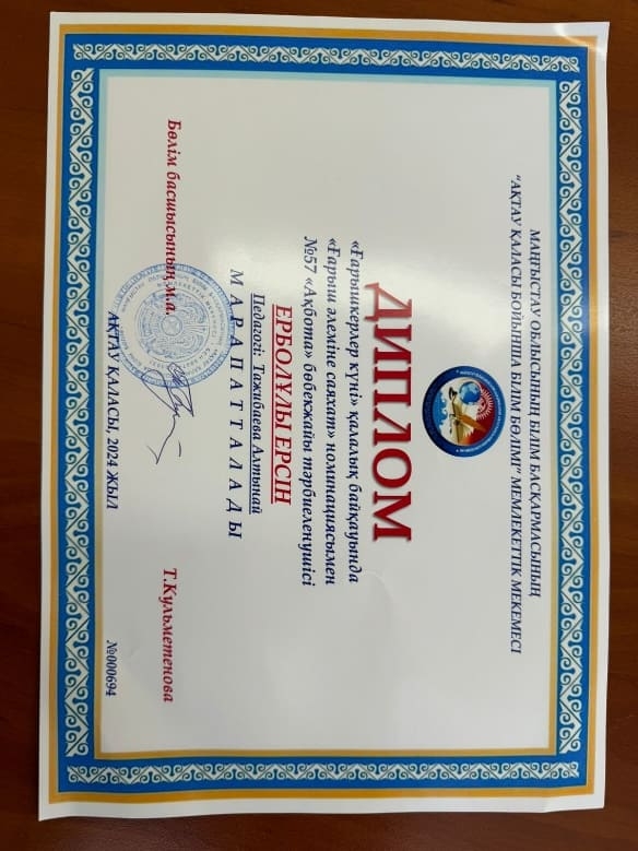 Маңғыстау облысының білім басқармасының “Білім берудің оқу-әдістемелік орталығы” КММ 07.02.2024ж.N40 нқ бұйрығына сәйкестақырыбында ұйымдастырылған облыстық дебат-пікірталасқа бөбекжайымыздың педагогі Жарылғасын Айгерім Бекболатқызы қатысып, дипломмен марапатталды.