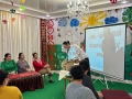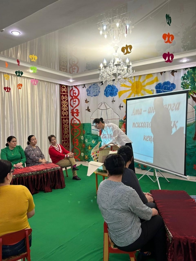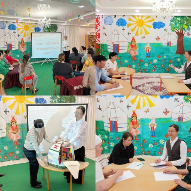 "Ата-аналарға психолиялық кеңес", "Бала тілін дамытудағы дамытушы ойындардың маңыздылығы" тақырыбында бөбекжай психологы М.Мұратбай мен бөбекжай дефектологы Ж.Халмурзаева ата аналарға кеңестер беріп, шебер сынып пен тренинг өткізді.