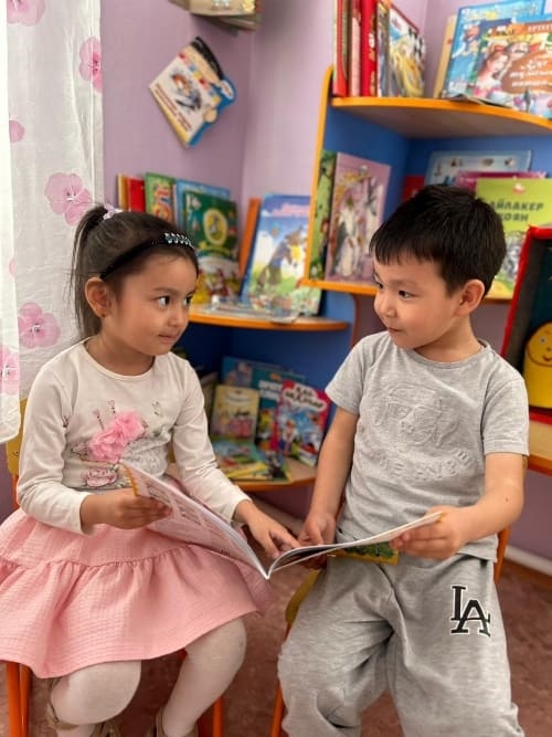 Бөбекжай тәрбиешілері балаларға сүйікті шығармаларын оқыды, ал балалар жарқын иллюстрацияларды қарастырды және бөбекжайдың кітап бұрышымен танысты.