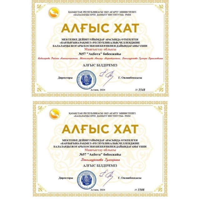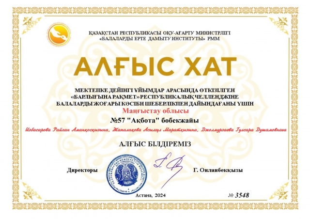Мектепке дейінгі ұйымдар арасында Алғыс айту күніне арналған республикалық№6 "Айгөлек" ересек топ тәрбиешісі Джолмурзаева Гулсара Душамовна тәрбиеленушілерімен қатысып Алғыс хатпен марапатталды.