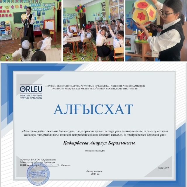 "Өрлеу БАҰОда өткен “Мектепке дейінгі ұйымдардың қазақ тілі педагогтерінің кәсіби құзыреттілігін дамыту” тақырыбындағы курстың көшпелі тәжірибелік сабағында курсқа қатысушы бөбекжайымыздың қазақ тілі маманы А.Б.Қадырбаева қазақ тілін оқыту іс-әрекетін ұйымдастырып, психологиялық тренинг пен шеберлік сағаттарында өз іс-тәжірибесімен бөлісіп, "Өрлеу" біліктілікті арттыру орталығының "Алғыс хатымен" марапатталды. Құттықтаймыз!