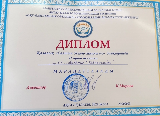 Ақтау қаласы бойынша білім бөлімінің "Оқу әдістемелік орталығы" КММ 18.03.2024жылғы №01-32-641хатына сәйкес, жұмыста кәсіби құзыреттіліктер мен инновациялық тәсілдерді меңгерудің жоғары деңгейін көрсететін талантты, шығармашылықпен жұмыс істейтін психологтарды анықтау, қолда
